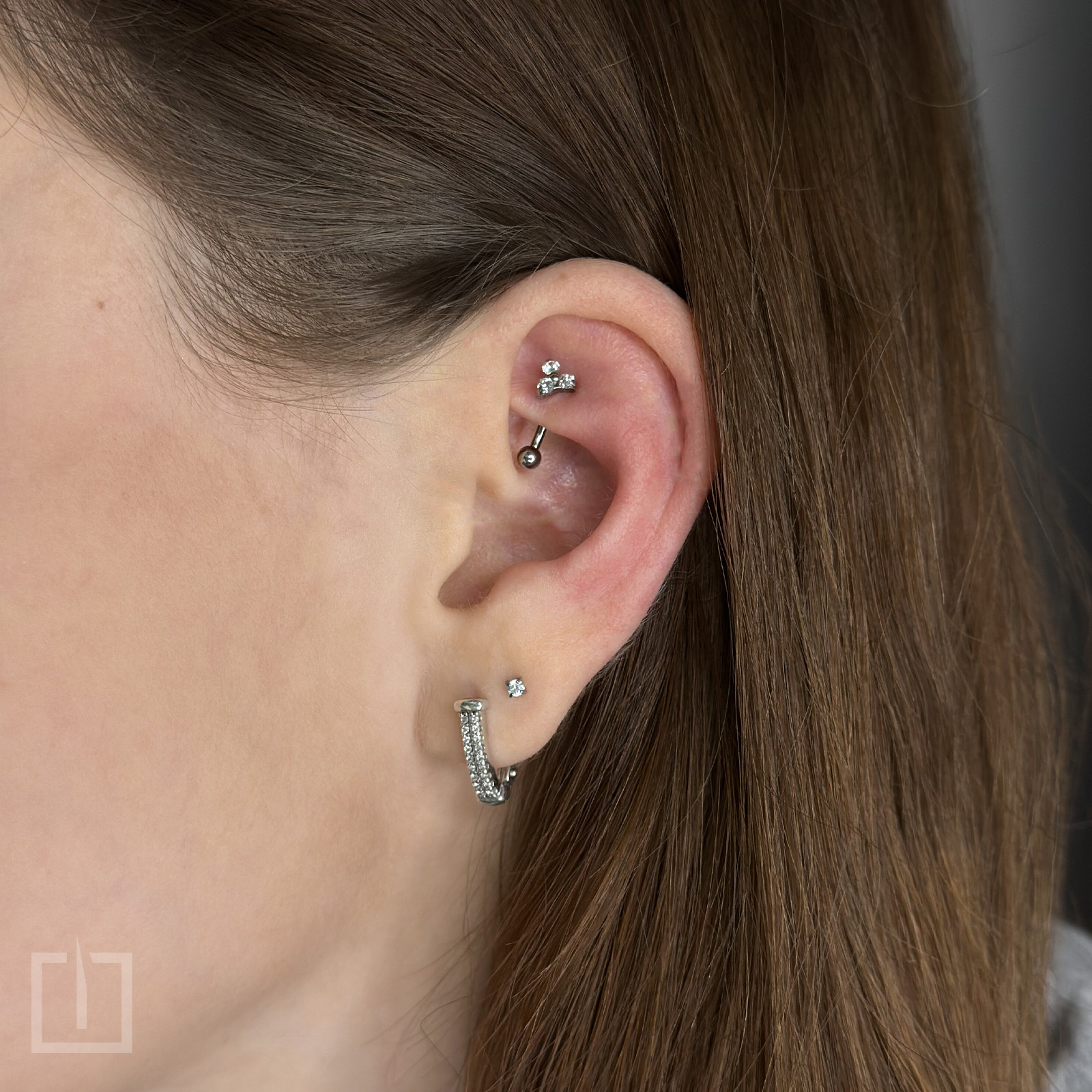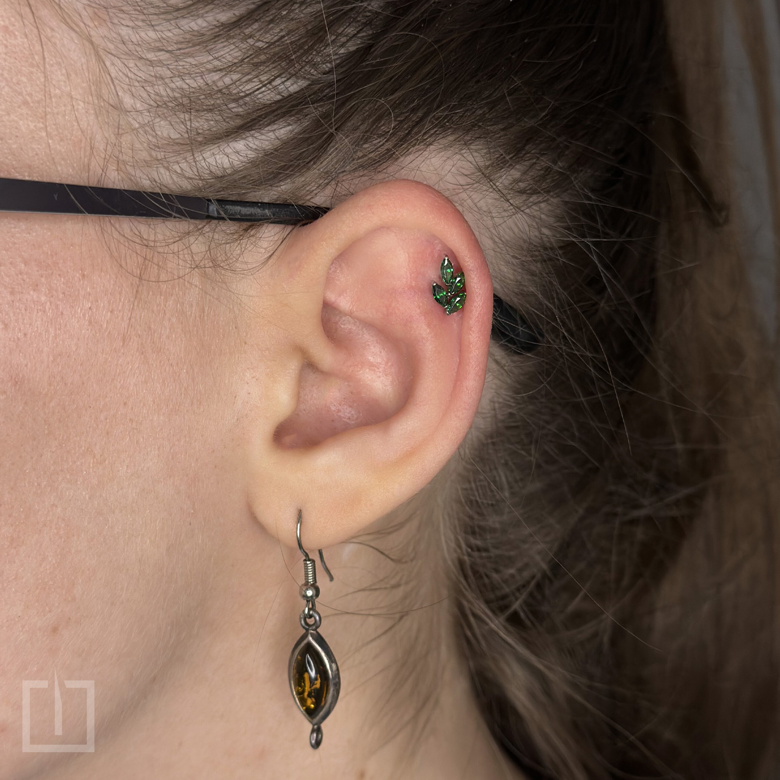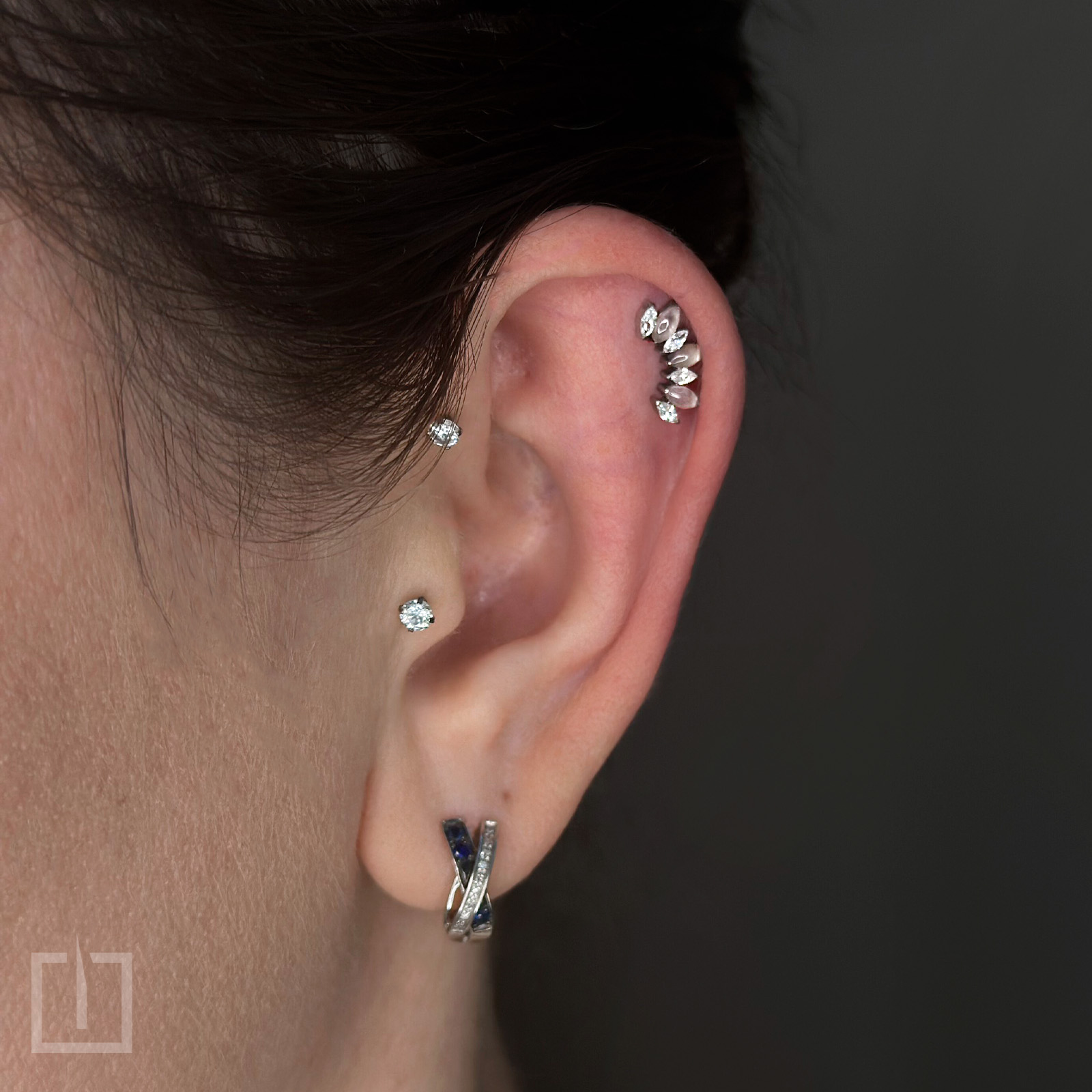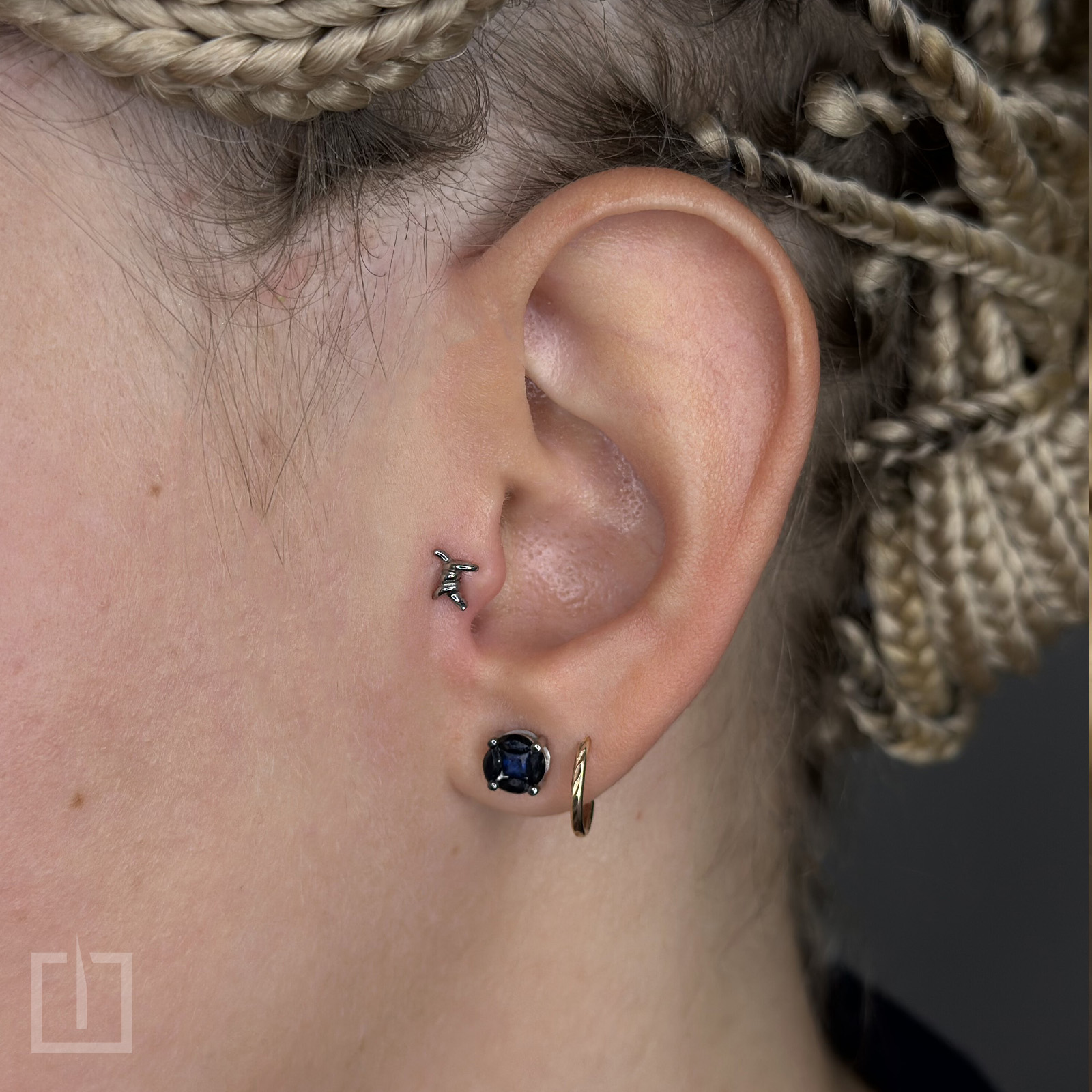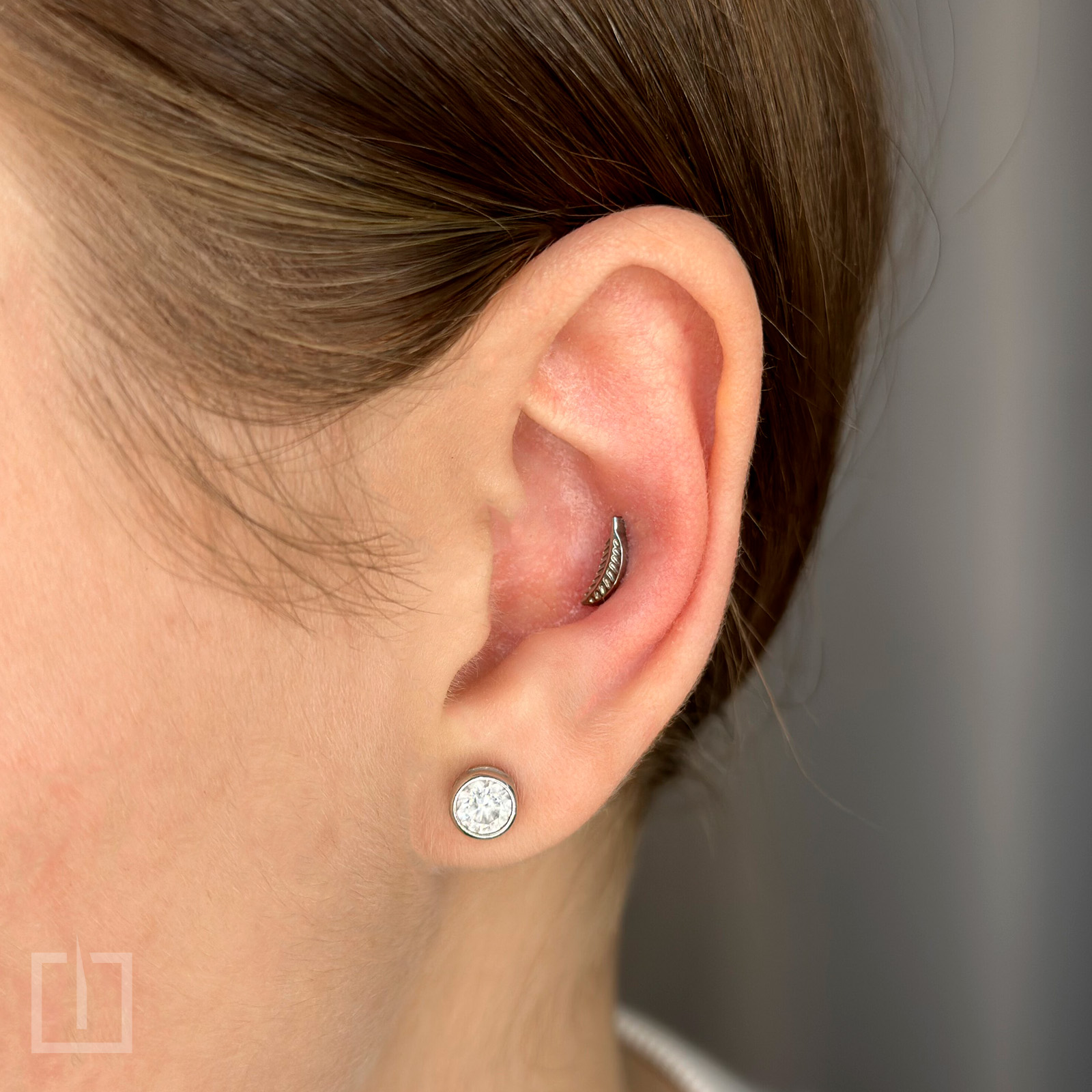 Пирсинг «Форвард Хеликс» — это необычный и стильный вариант, который набирает популярность благодаря своему уникальному и привлекательному внешнему виду. Этот аккуратный и элегантный прокол располагается в верхней части хряща, рядом с основанием уха, создавая интересный акцент. Пирсинг идеально подходит для тех, кто хочет добавить изюминку в свой образ и выразить свою индивидуальность с помощью оригинальных украшений.