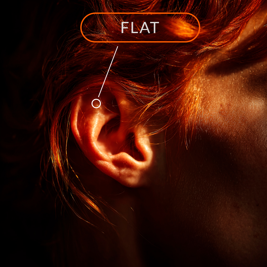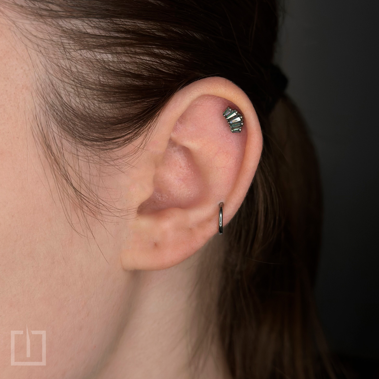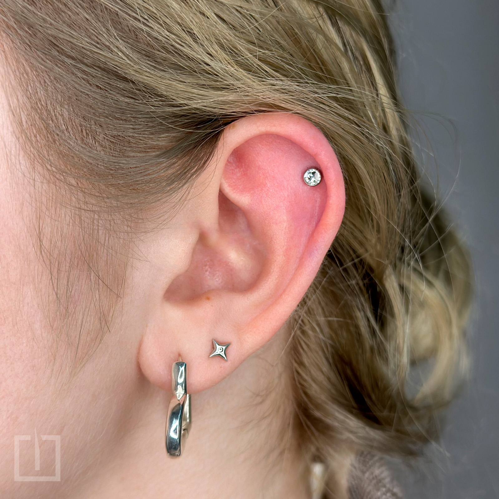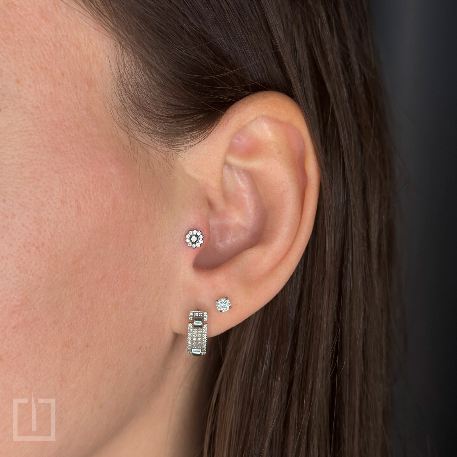 Пирсинг «Флэт» выполняется в плоской области верхнего хряща и придаёт уху интересный акцент. Этот вид пирсинга становится всё более популярным благодаря своему уникальному внешнему виду и возможности комбинировать его с другими проколами. Он идеально подходит для создания стильных многослойных образов и позволяет свободно экспериментировать с разнообразными украшениями.