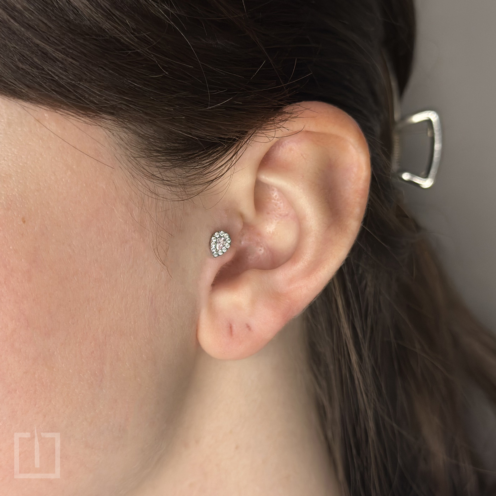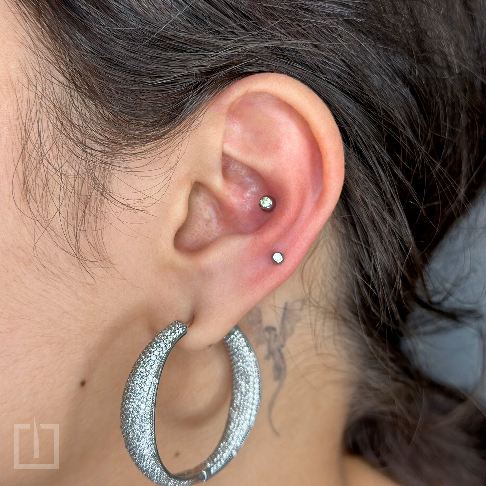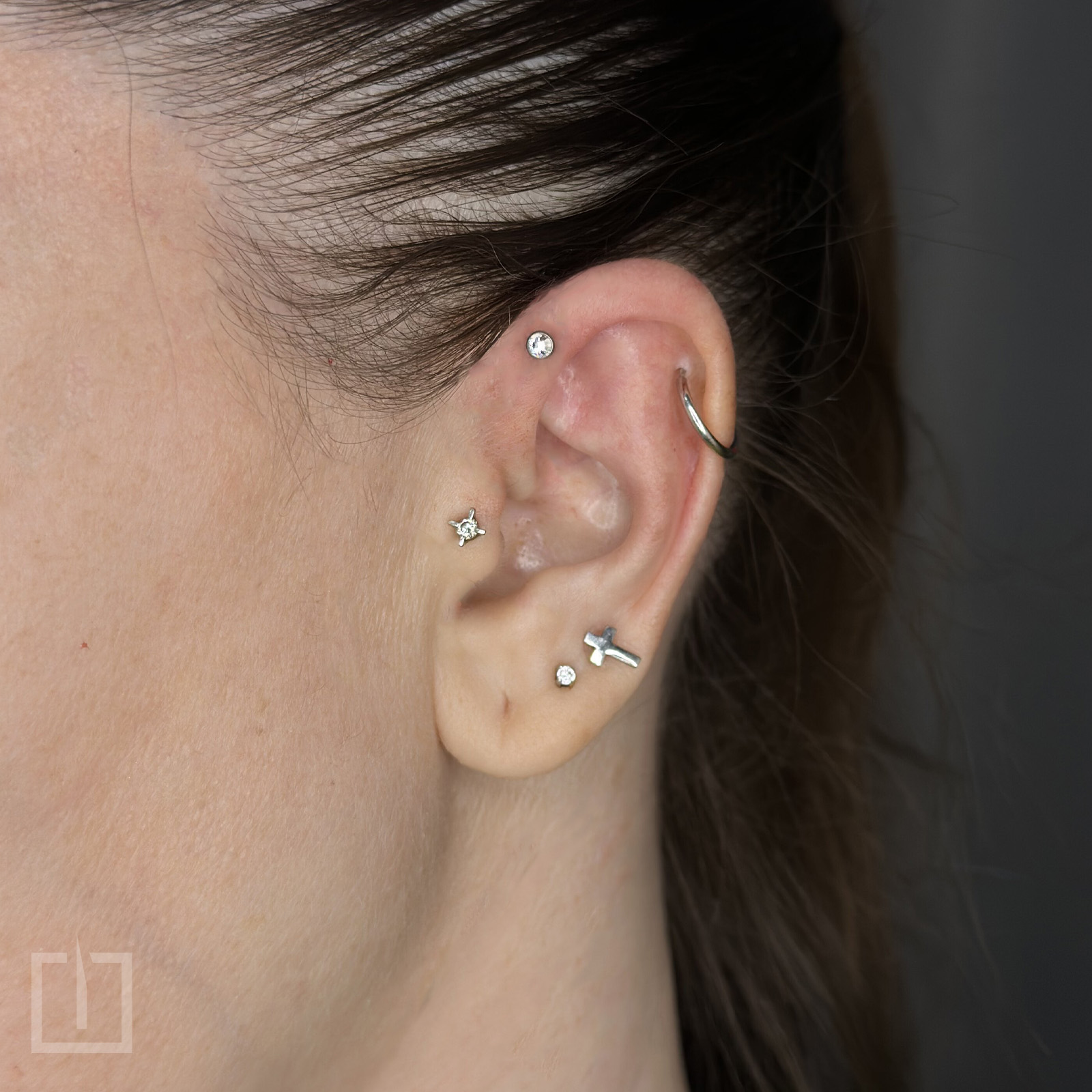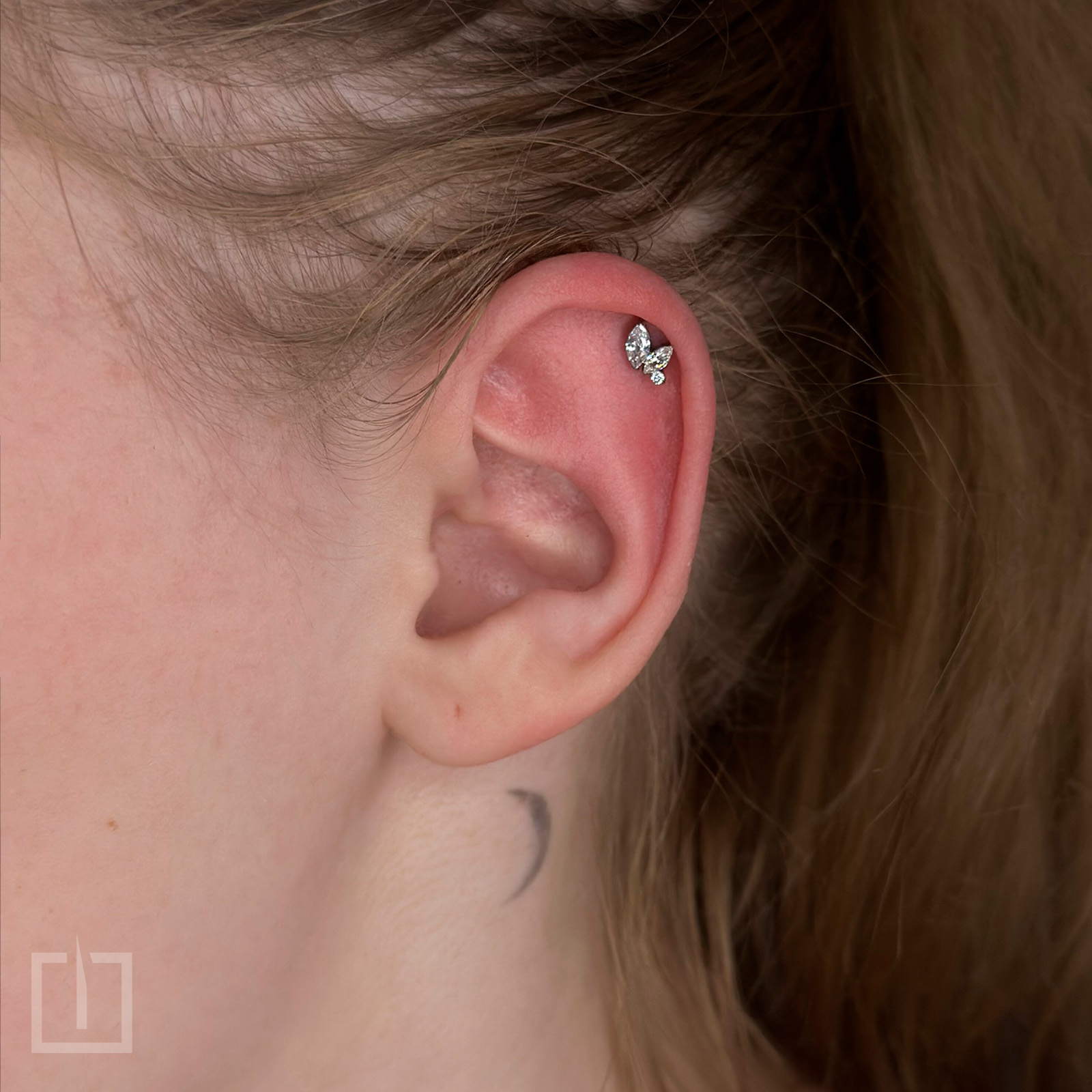 Пирсинг «Флэт» выполняется в плоской области верхнего хряща и придаёт уху интересный акцент. Этот вид пирсинга становится всё более популярным благодаря своему уникальному внешнему виду и возможности комбинировать его с другими проколами. Он идеально подходит для создания стильных многослойных образов и позволяет свободно экспериментировать с разнообразными украшениями.