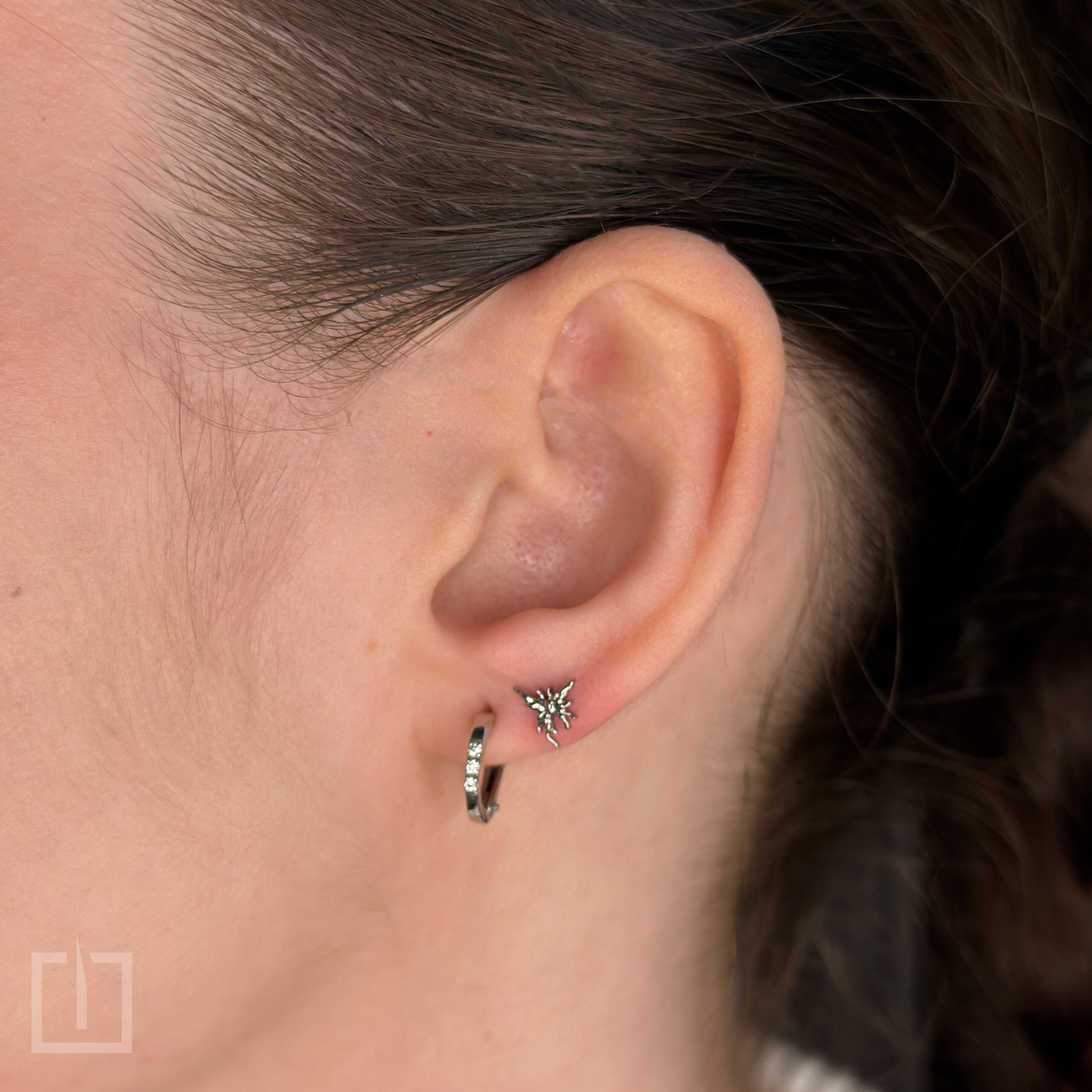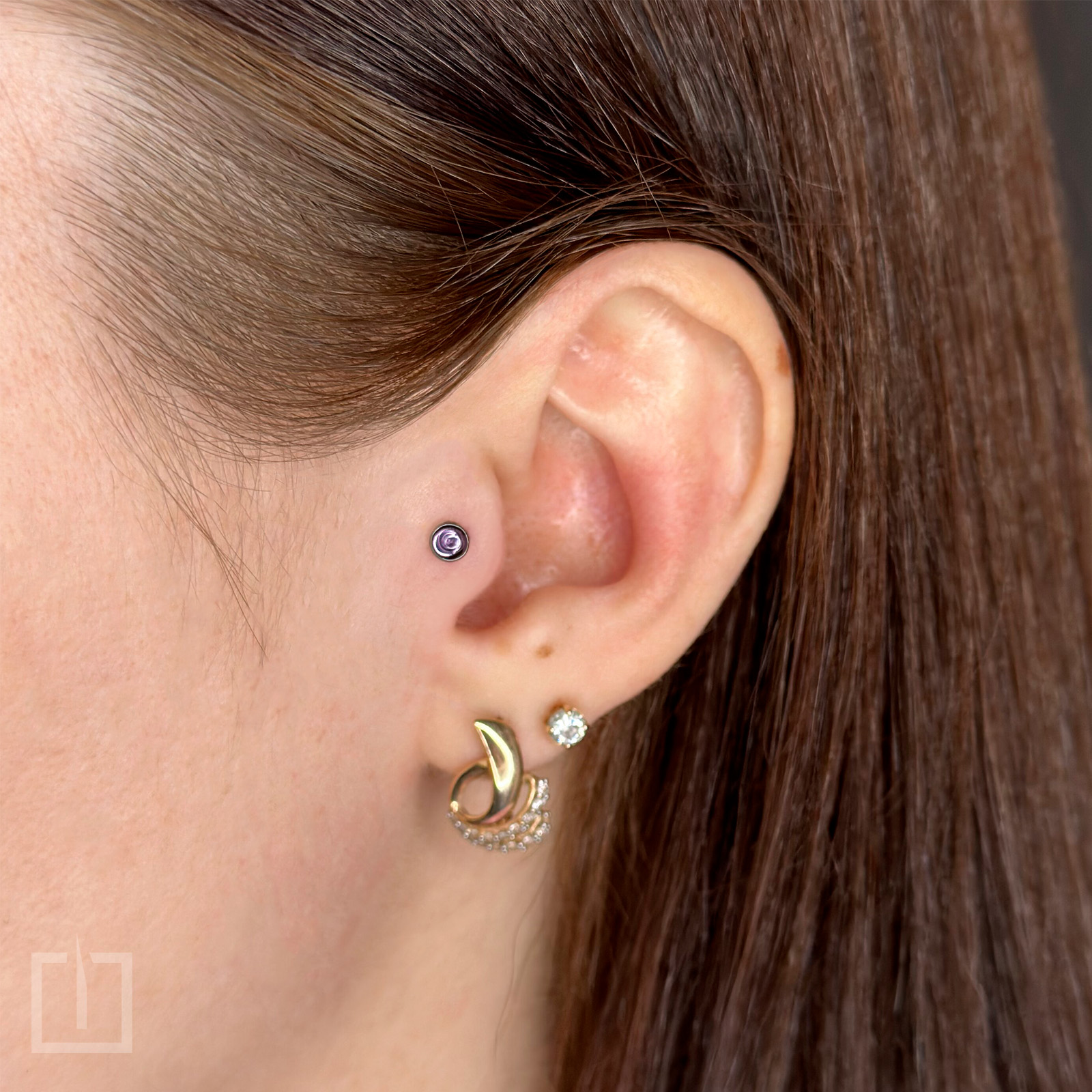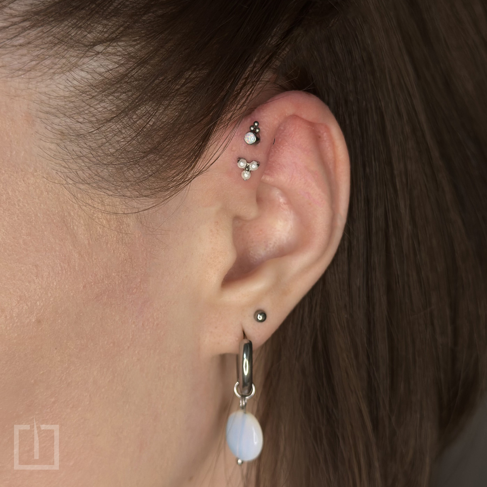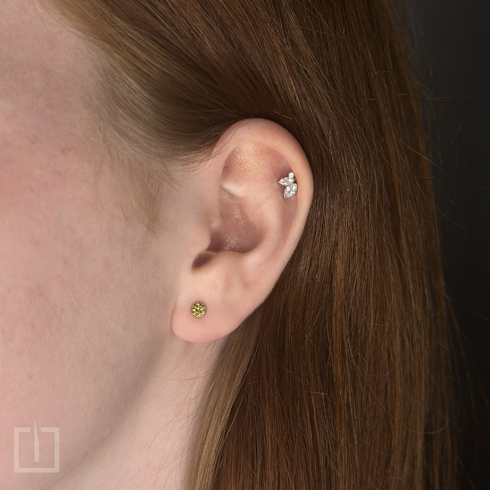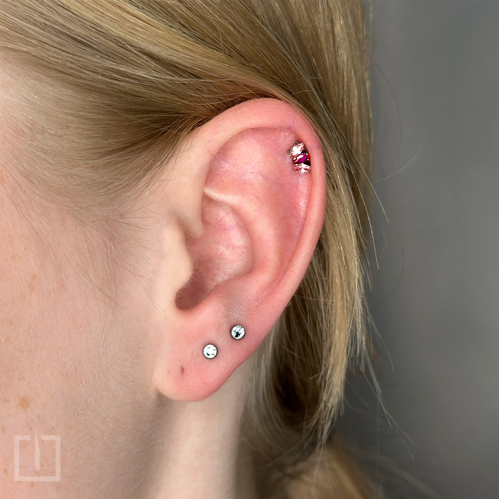 Пирсинг «Флэт» выполняется в плоской области верхнего хряща и придаёт уху интересный акцент. Этот вид пирсинга становится всё более популярным благодаря своему уникальному внешнему виду и возможности комбинировать его с другими проколами. Он идеально подходит для создания стильных многослойных образов и позволяет свободно экспериментировать с разнообразными украшениями.