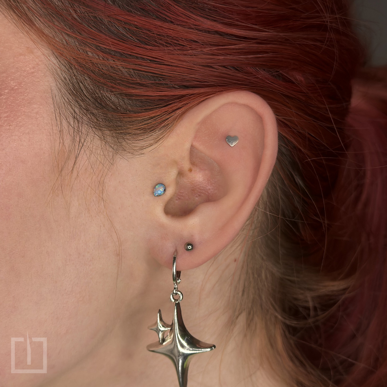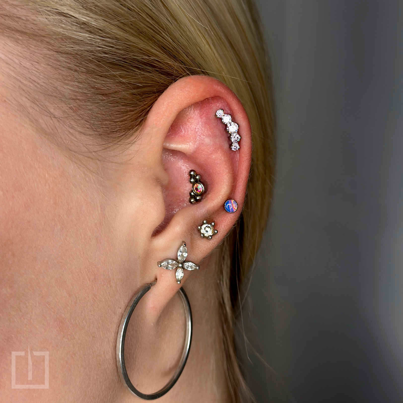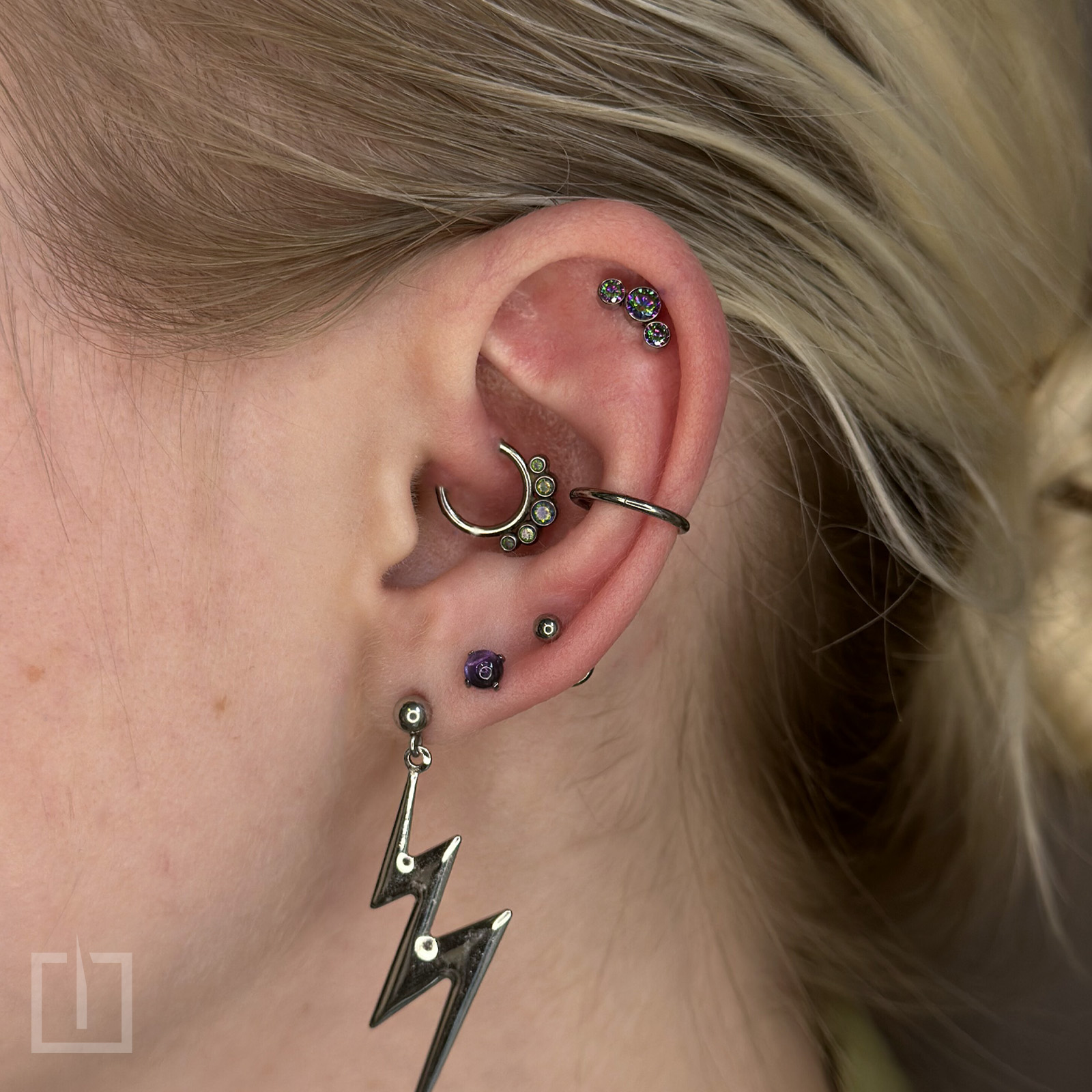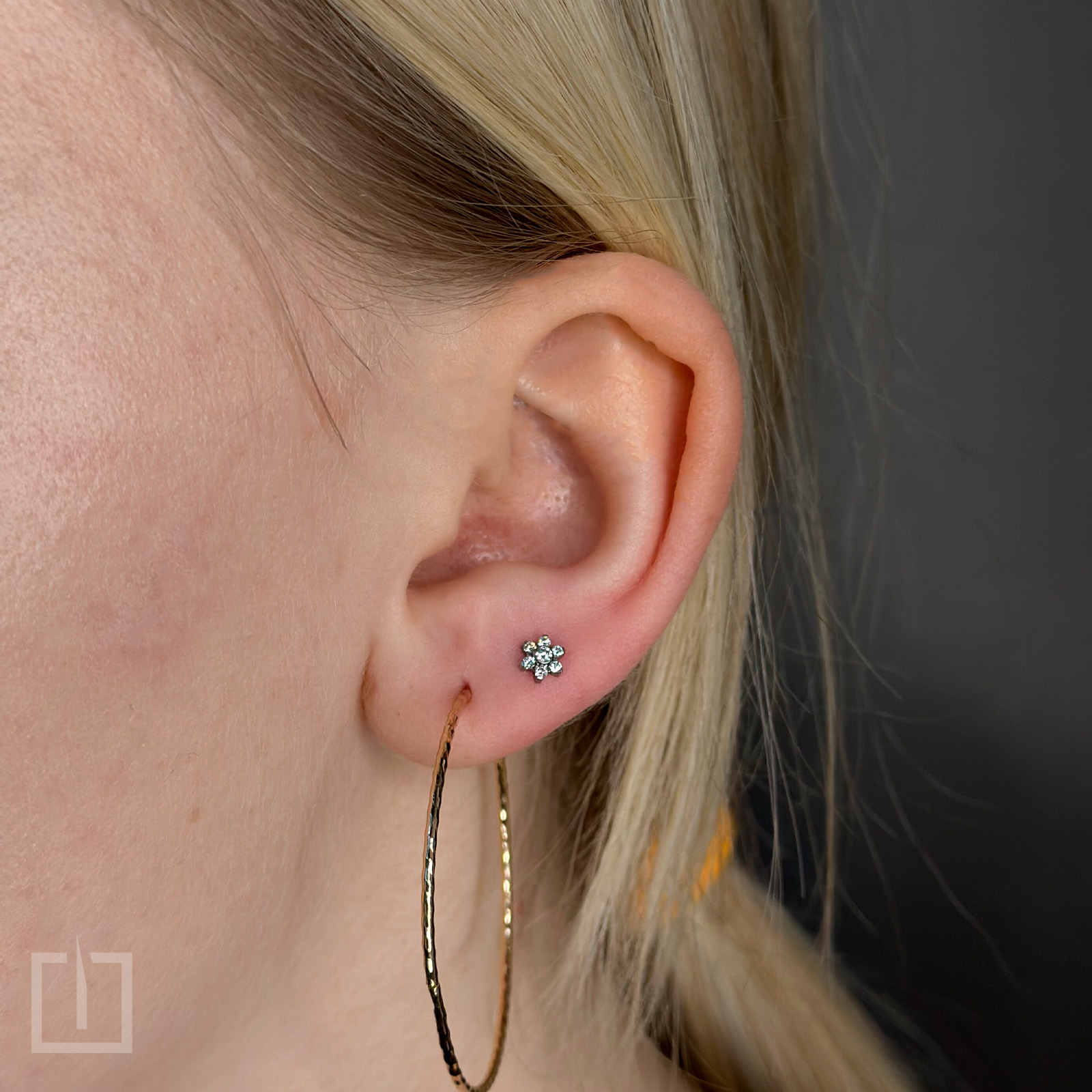 Пирсинг «Флэт» выполняется в плоской области верхнего хряща и придаёт уху интересный акцент. Этот вид пирсинга становится всё более популярным благодаря своему уникальному внешнему виду и возможности комбинировать его с другими проколами. Он идеально подходит для создания стильных многослойных образов и позволяет свободно экспериментировать с разнообразными украшениями.