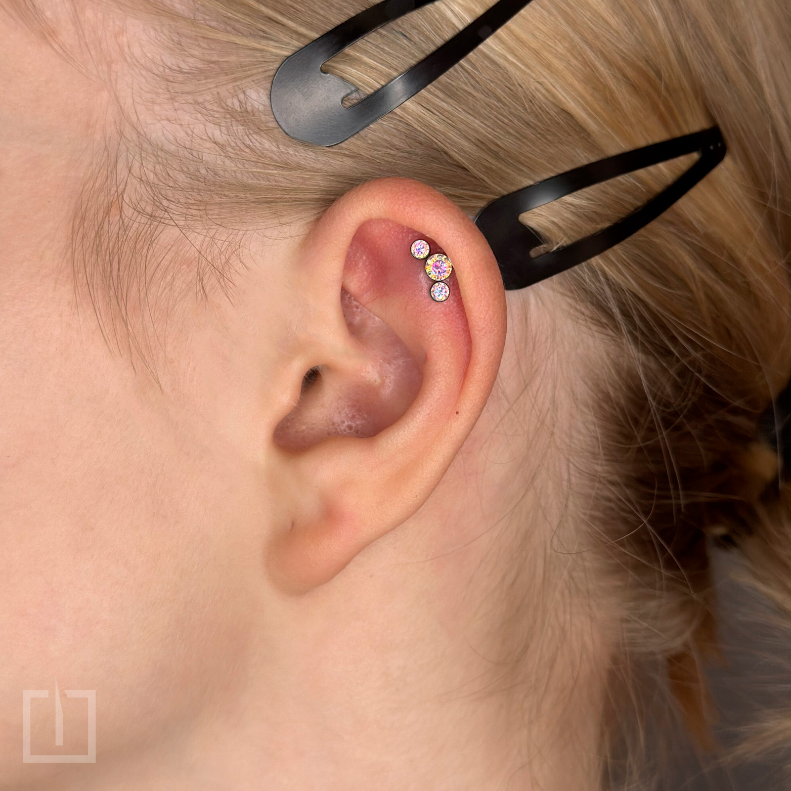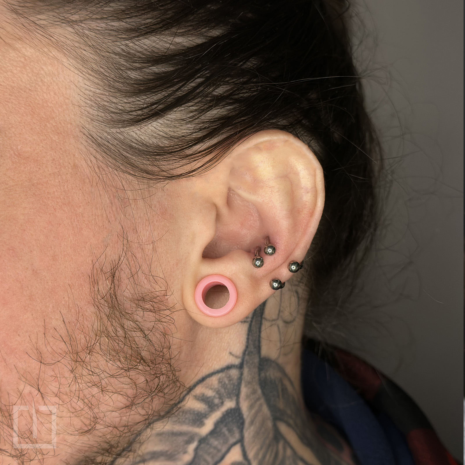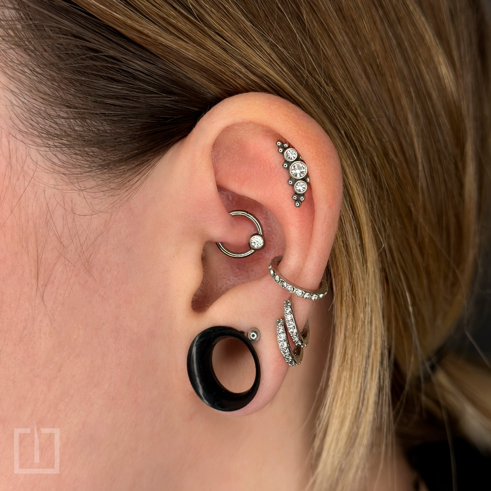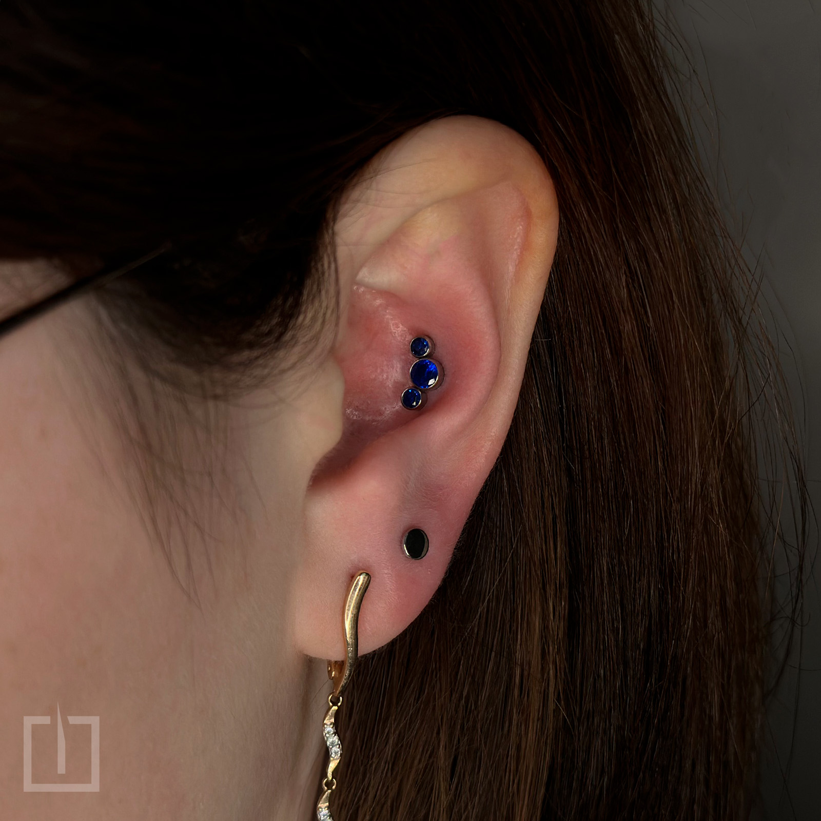 Пирсинг «Флэт» выполняется в плоской области верхнего хряща и придаёт уху интересный акцент. Этот вид пирсинга становится всё более популярным благодаря своему уникальному внешнему виду и возможности комбинировать его с другими проколами. Он идеально подходит для создания стильных многослойных образов и позволяет свободно экспериментировать с разнообразными украшениями.
