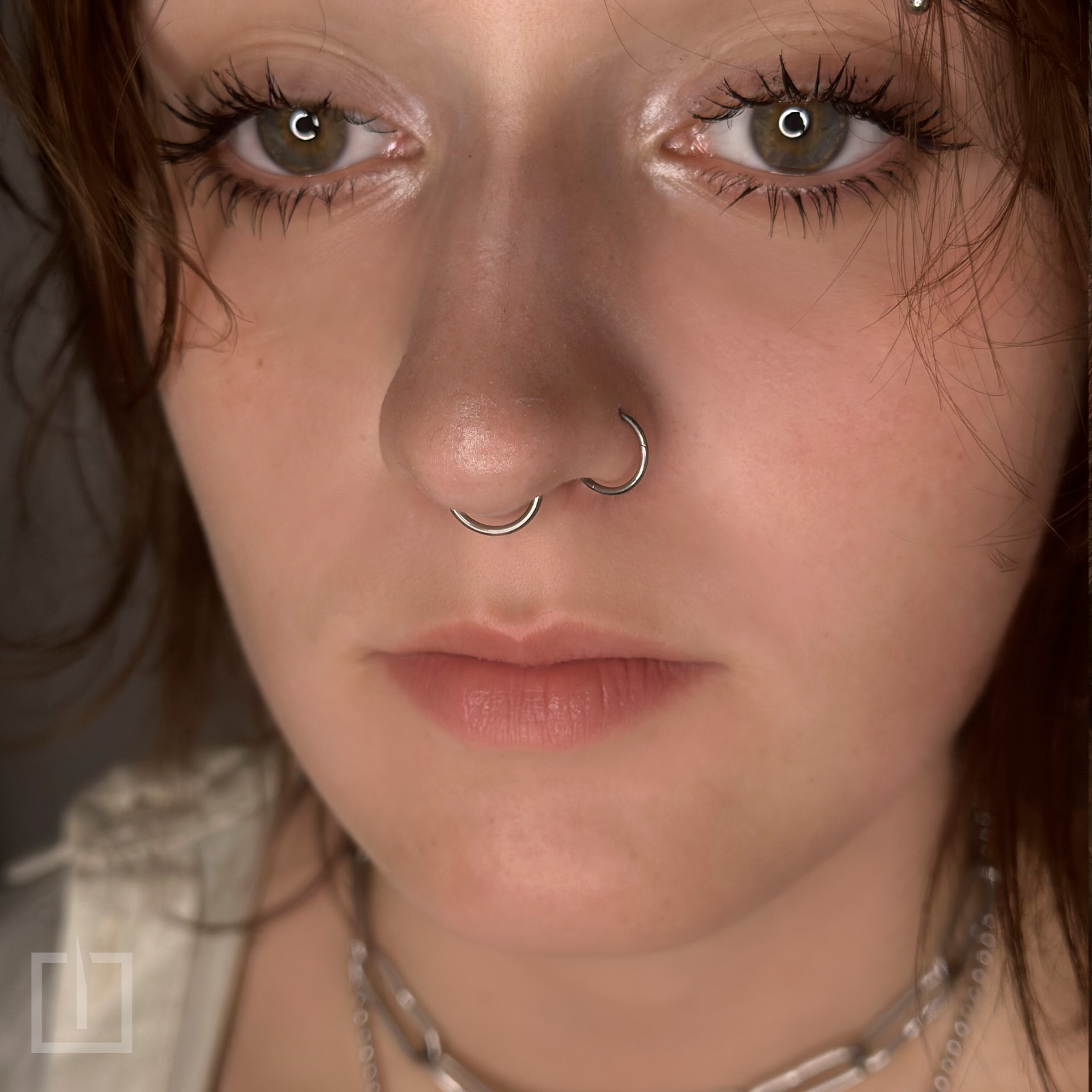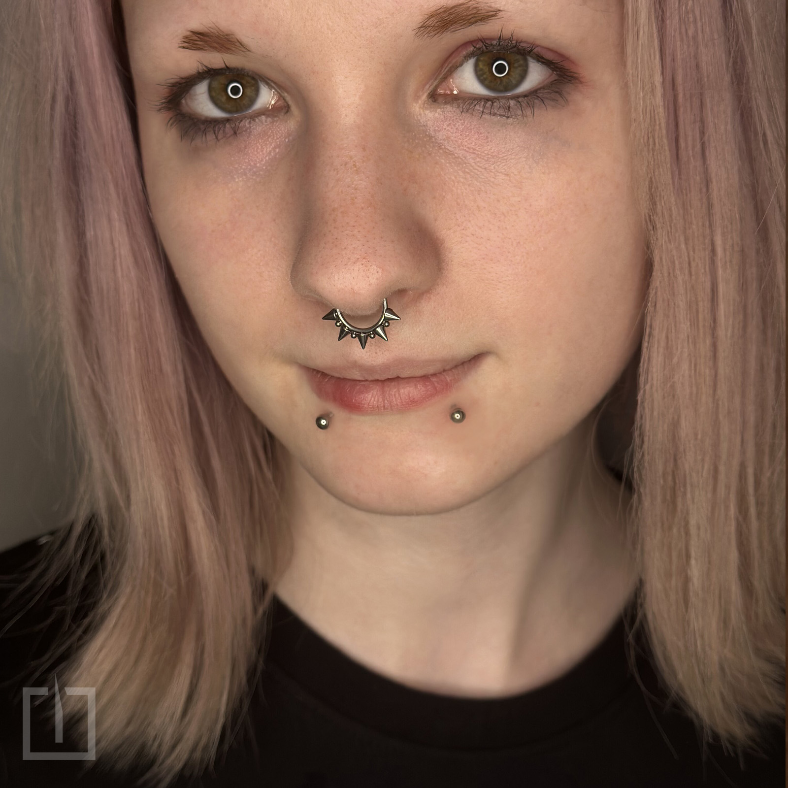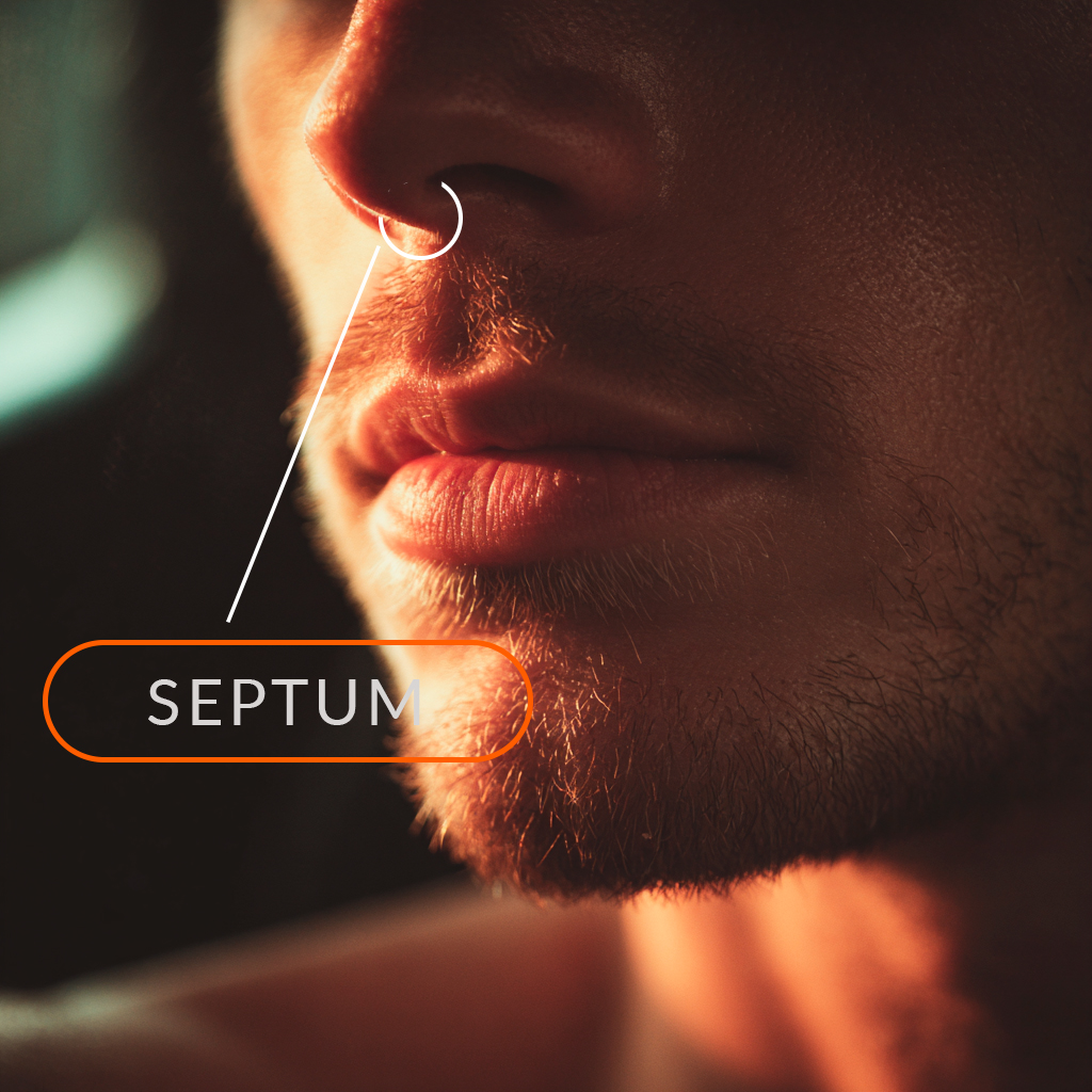 Пирсинг «Септум» — остаётся одним из самых актуальных видов пирсинга последних лет и является одним из немногих, где можно сразу установить кольцо. Прокол располагается в центральной носовой перегородке между ноздрями, в области, известной как "sweet spot", что позволяет избежать повреждения хряща. Этот пирсинг создаёт выразительный акцент на лице и отлично подходит для создания уникального стиля.