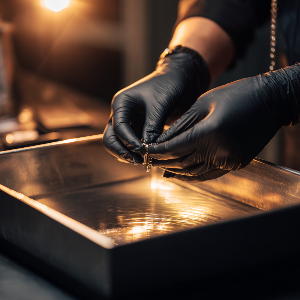 Чистка с дезраствором в специальном оборудовании: мы используем ультразвуковую ванну, чтобы эффективно удалить грязь с камней и внутренней и наружной сторон изделия.