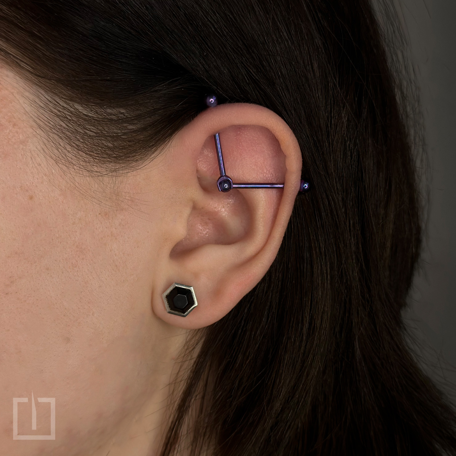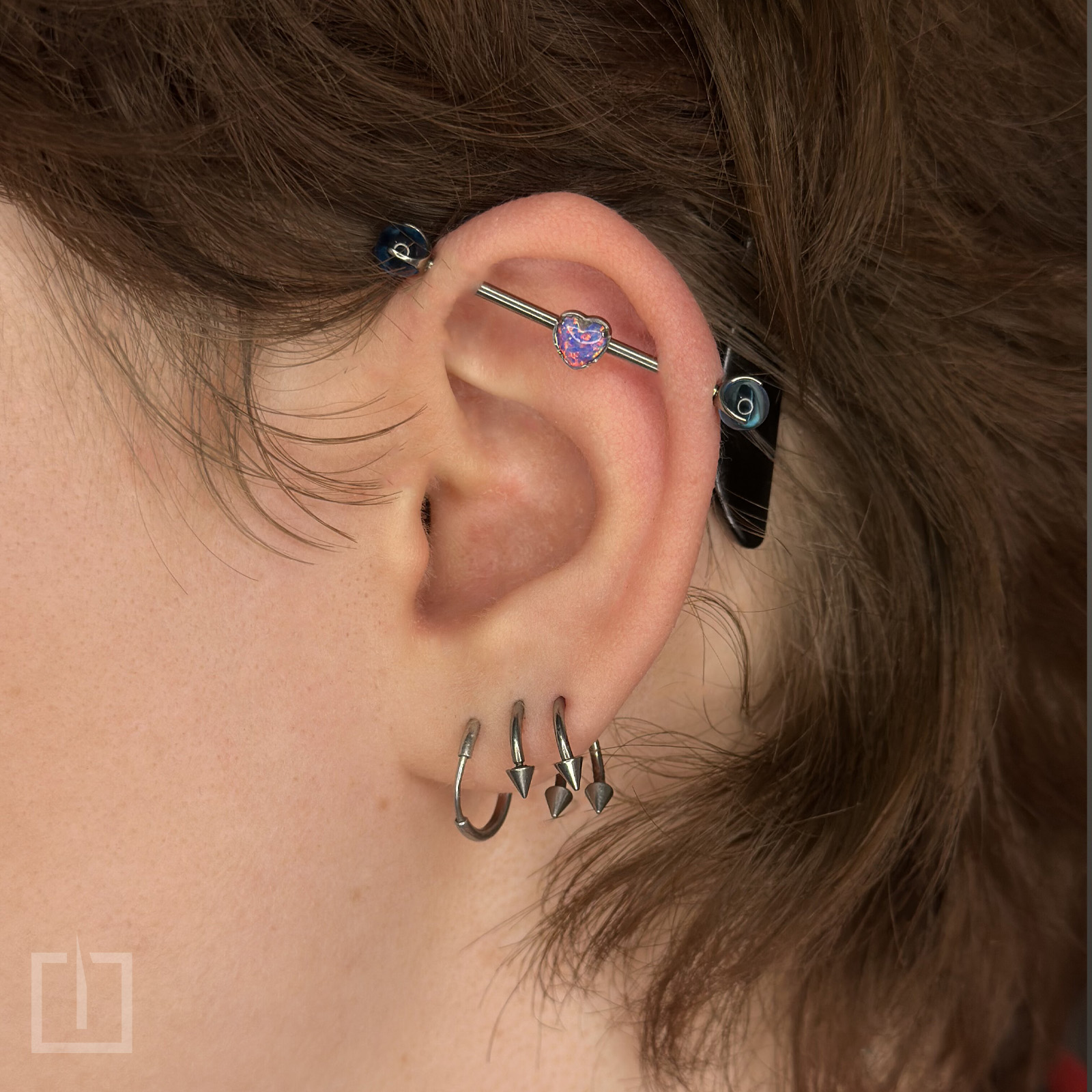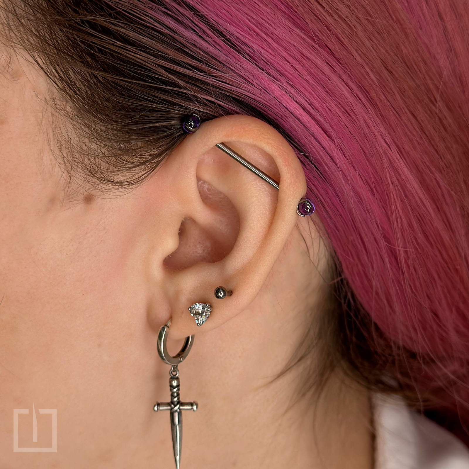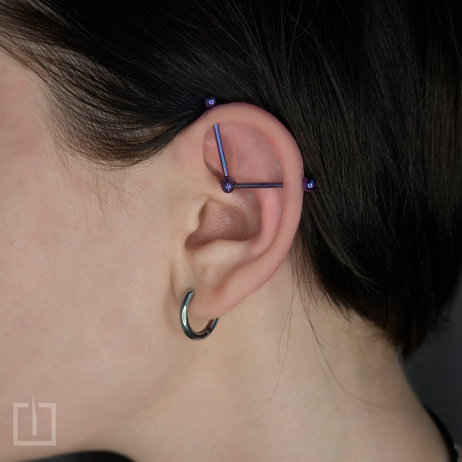 Пирсинг «Индастриал» — это необычный и впечатляющий вид пирсинга, который объединяет два прокола в верхней части уха. Один прокол располагается ближе к лицу, а второй — на противоположной стороне, создавая эффектный и стильный акцент. Украшение может быть выполнено в виде штанги, которая как прямой формы, так и с разнообразными изгибами, что позволяет добавить индивидуальности вашему образу. Этот пирсинг становится всё более популярным среди тех, кто ищет уникальные способы самовыражения.