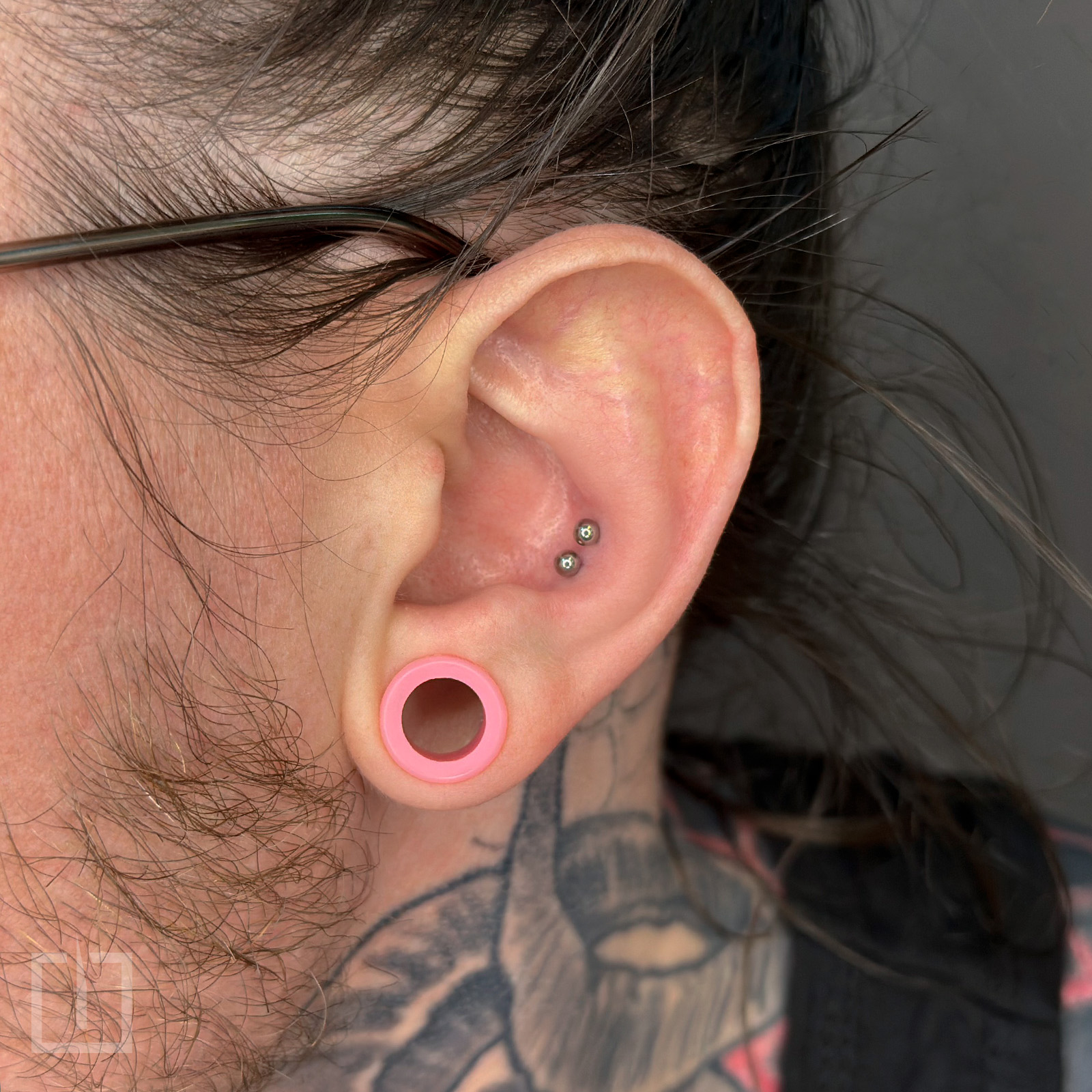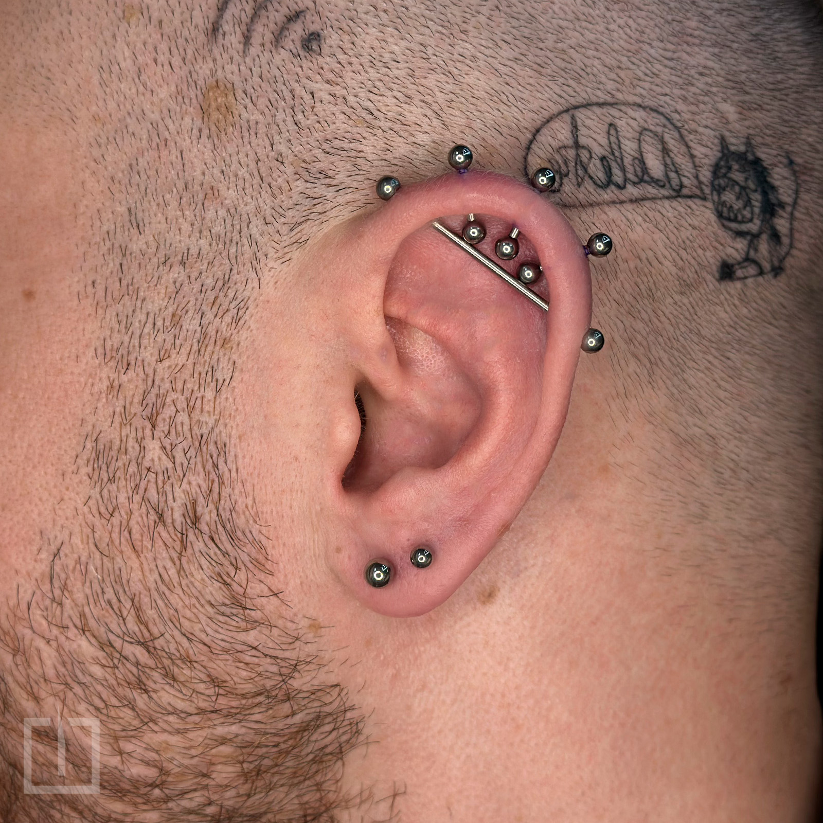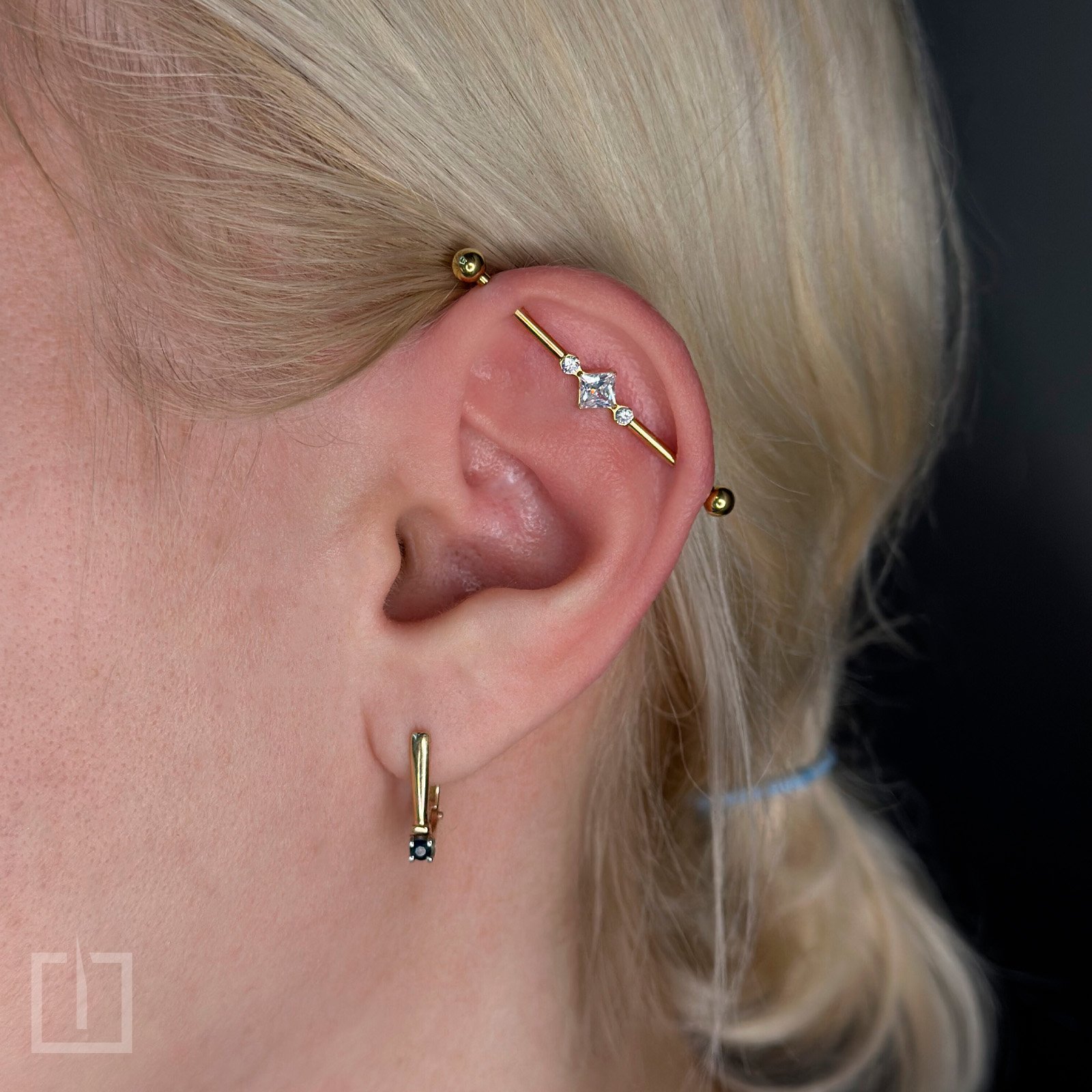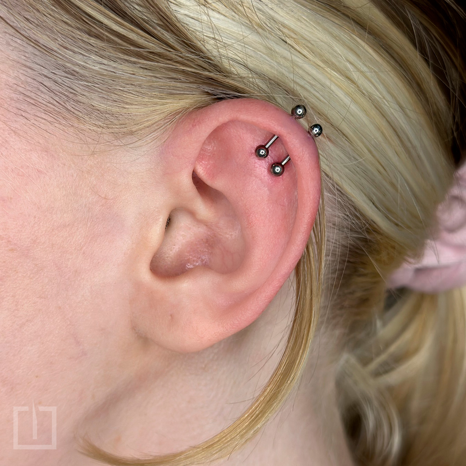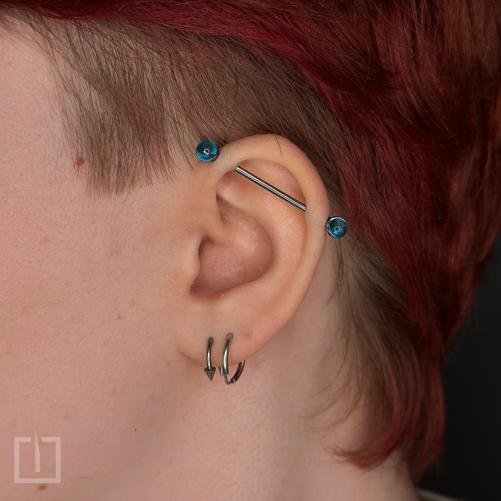 Пирсинг «Индастриал» — это необычный и впечатляющий вид пирсинга, который объединяет два прокола в верхней части уха. Один прокол располагается ближе к лицу, а второй — на противоположной стороне, создавая эффектный и стильный акцент. Украшение может быть выполнено в виде штанги, которая как прямой формы, так и с разнообразными изгибами, что позволяет добавить индивидуальности вашему образу. Этот пирсинг становится всё более популярным среди тех, кто ищет уникальные способы самовыражения.